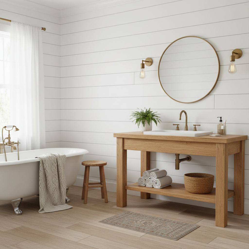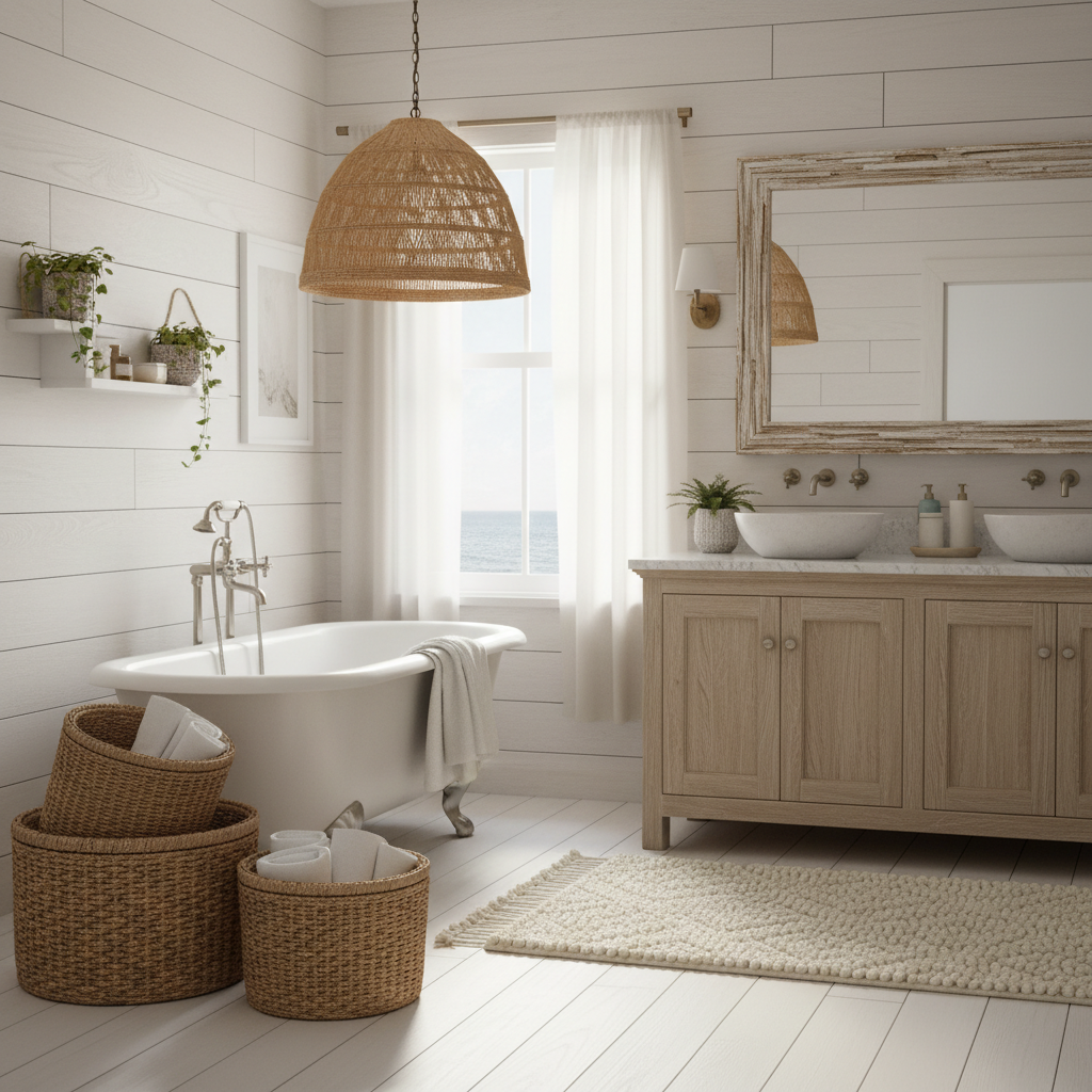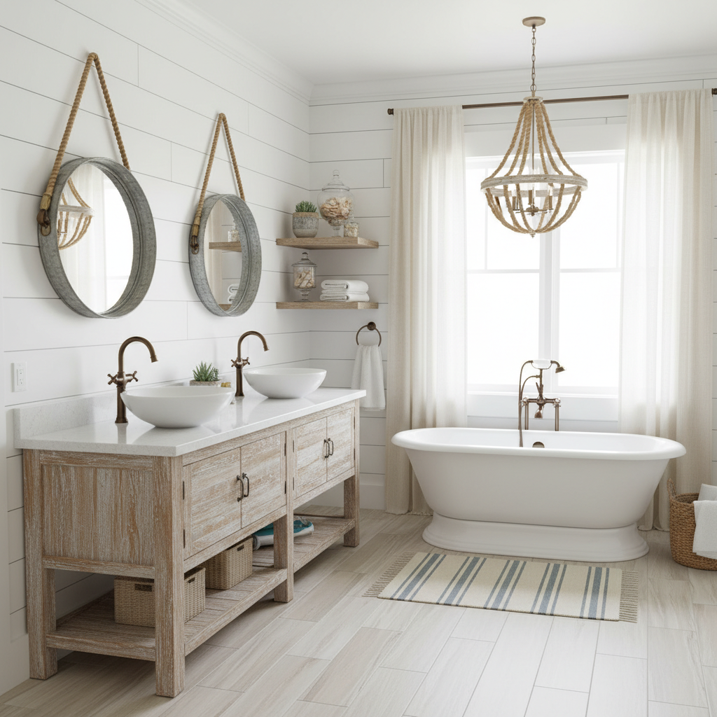 Shiplap walls are a hallmark of coastal and farmhouse styles, offering a clean, architectural texture that evokes seaside cottages. Typically painted crisp white, shiplap provides a bright, airy backdrop for any coastal decor. It can be used on all walls or as an accent wall behind the vanity or tub. Complement shiplap with natural wood elements, such as a sturdy oak vanity or floating shelves, and simple, classic fixtures. The result is a fresh, inviting, and effortlessly charming bathroom with a distinct nautical heritage.