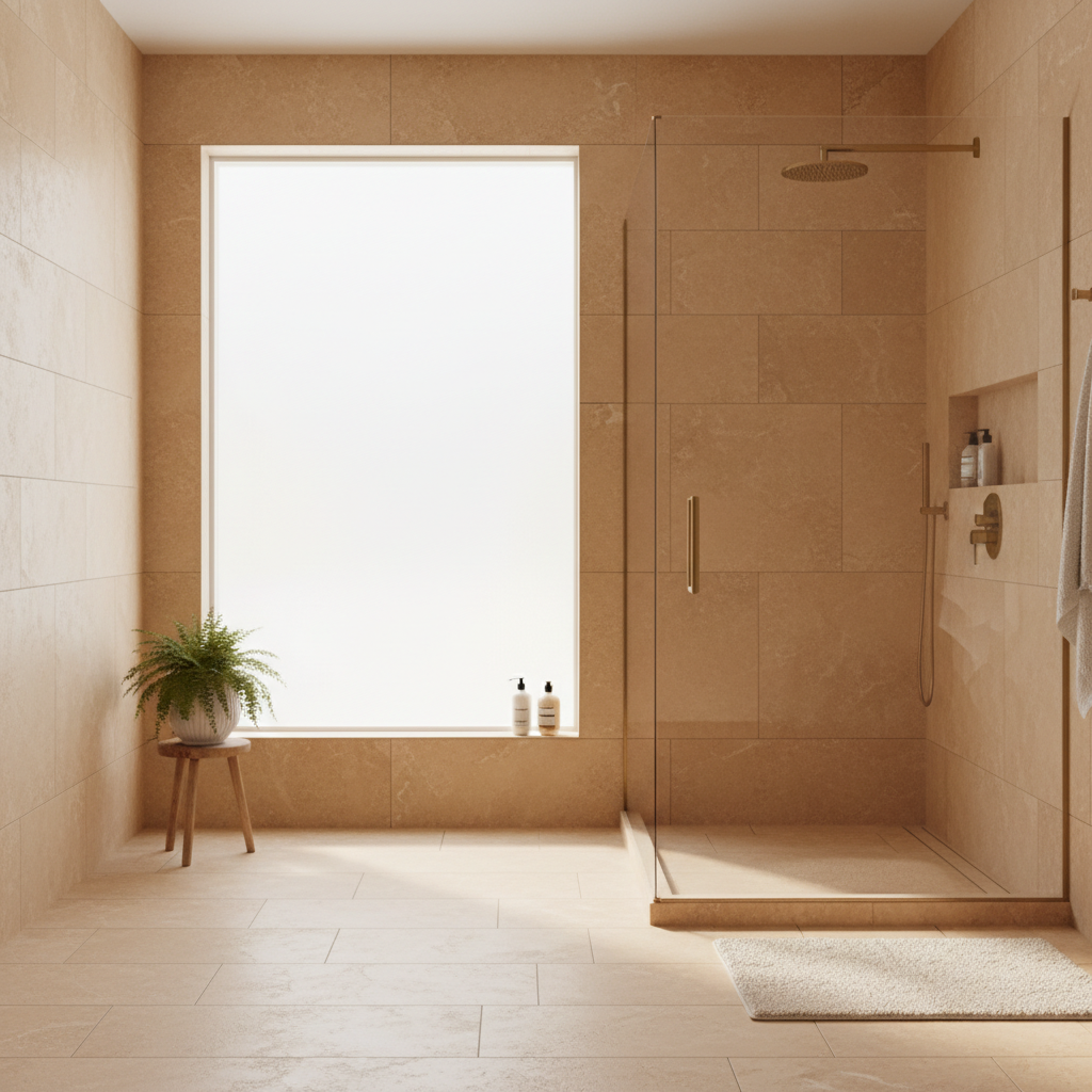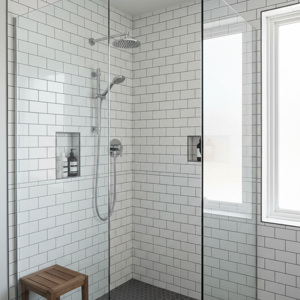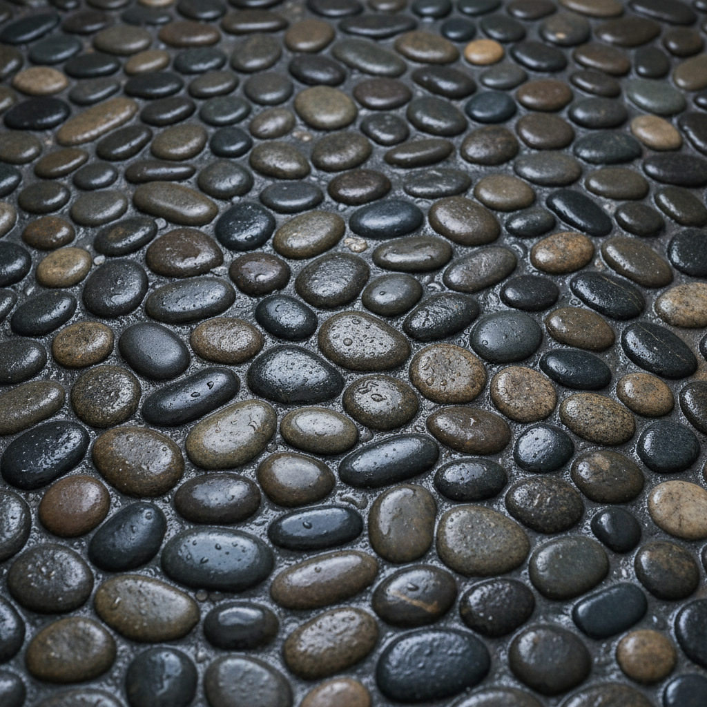 Bring the sensation of walking on a natural beach into your shower with a pebble stone floor. Smooth, flat river rocks or beach pebbles, set in grout, create a unique tactile experience and a visually stunning organic texture. This natural material offers a gentle massage for your feet and introduces an earthy element that contrasts beautifully with sleek glass shower doors and white wall tiles. The color palette of the pebbles—grays, browns, and creams—is naturally grounding and enhances the overall serene, spa-like feel.