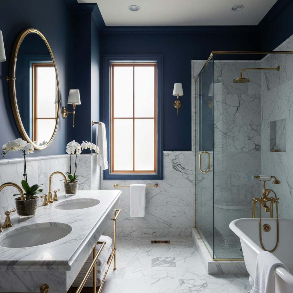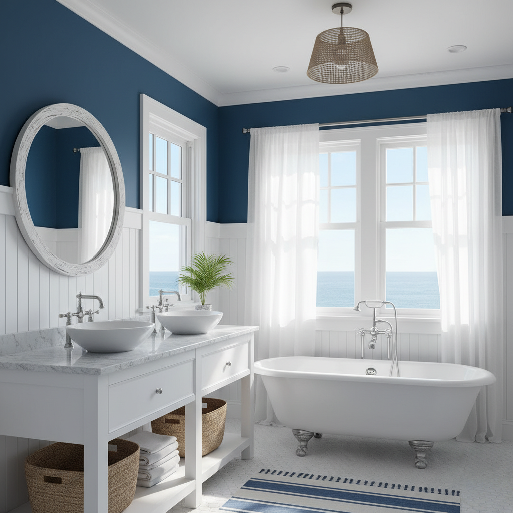 Elevate coastal design with a sophisticated palette of deep navy and polished brass. Dark navy walls or a navy vanity create a dramatic, luxurious backdrop, reminiscent of the deep ocean. Contrast this with the warm, rich gleam of polished brass faucets, light fixtures, and hardware. White marble countertops and crisp white towels will provide necessary balance and brightness. This combination offers a more formal and opulent coastal feel, perfect for a powder room or a master bath seeking a touch of refined glamour and depth.