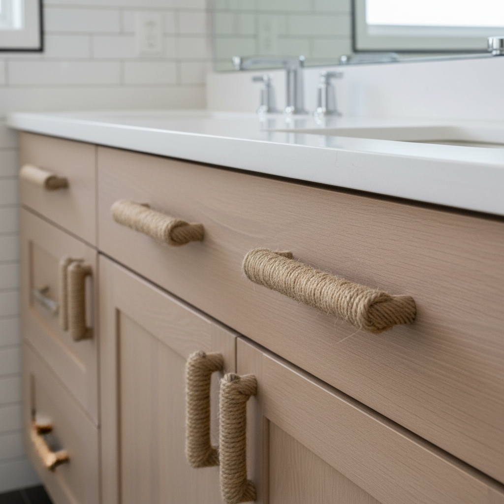 Incorporate nautical charm with rope details on hardware. This could mean cabinet pulls wrapped in natural jute or sisal rope, or even a mirror hung from thick decorative rope. The texture of the rope adds a rustic, handcrafted element that immediately brings to mind sailing and seaside living. Pair these details with natural wood vanities or crisp white cabinetry. The material adds warmth and an authentic maritime touch, making the bathroom feel unique and thoughtfully curated.