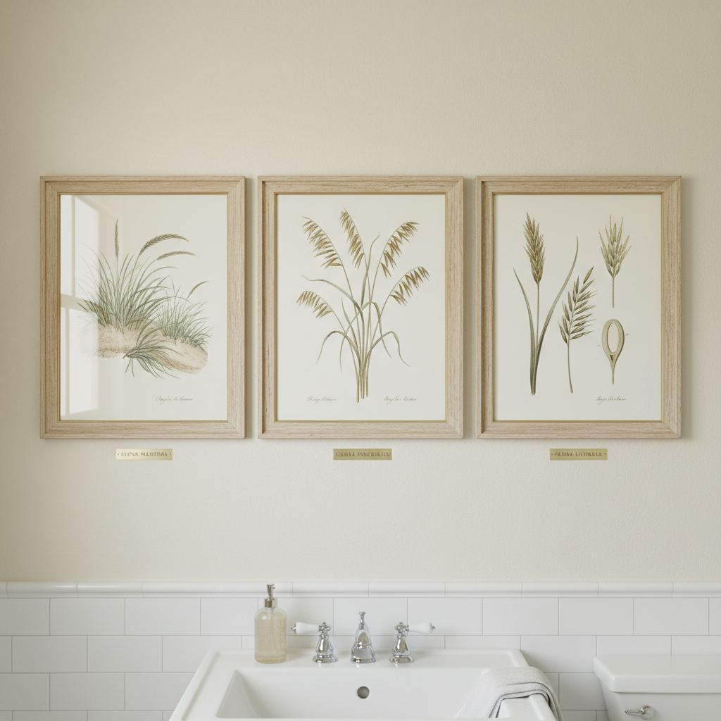 Celebrate the unique flora of coastal environments with botanical prints of sea oats, dune grasses, or palm fronds. These elegant prints, often in muted greens and natural tones, bring a touch of living nature indoors without the maintenance of actual plants. Frame them in simple wood or white frames and arrange them in a gallery wall or as a focal point above the tub. This decor choice adds a sophisticated, organic element that connects the space to the natural landscape beyond the beach itself.