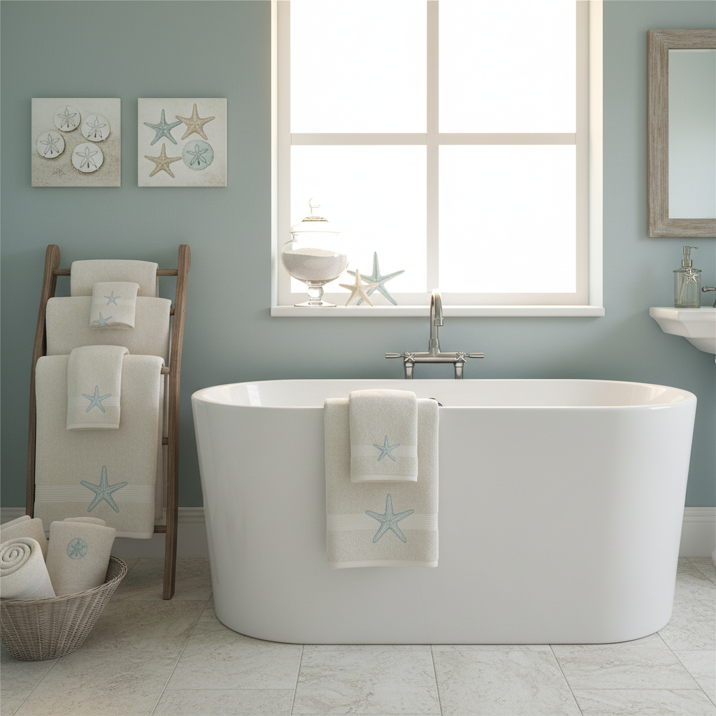 Embrace classic coastal motifs with starfish and sand dollar accents. These iconic symbols of the sea can be incorporated subtly through embroidered towels, small decorative sculptures on a shelf, or delicate art prints. Avoid overdoing it to maintain an elegant, rather than themed, look. The natural shapes and textures of these creatures bring a sense of wonder and connection to the ocean floor. Paired with soft blues, whites, and natural textures, these motifs add a charming and recognizable touch of beach-style decor.