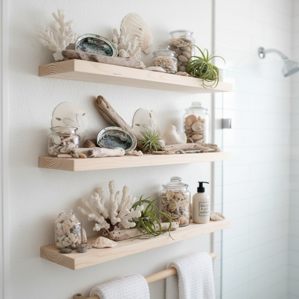 Create a curated display of your favorite beach finds and natural treasures on open shelving. Instead of traditional closed cabinets, opt for minimalist floating shelves made from reclaimed wood or white-painted planks. Arrange collected seashells, smooth sea glass, delicate coral pieces, and small potted succulents. This approach allows your decor to become part of the room’s art, adding personal character and a sense of discovery. The mood is relaxed, personal, and celebrates the beauty of found objects.