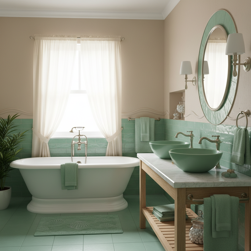 Embrace the gentle hues of the shoreline with a palette dominated by soft sandy beiges and delicate seafoam greens. This combination creates an inherently soothing atmosphere, reminiscent of gentle waves meeting the shore. Think of walls painted in a warm, light beige, complemented by towels, bath mats, or a vanity in a muted seafoam green. Materials like light oak or bleached wood for vanities and woven seagrass baskets will enhance this natural, airy feel, while polished nickel fixtures add a touch of understated elegance. The mood is one of quiet contemplation and natural beauty.