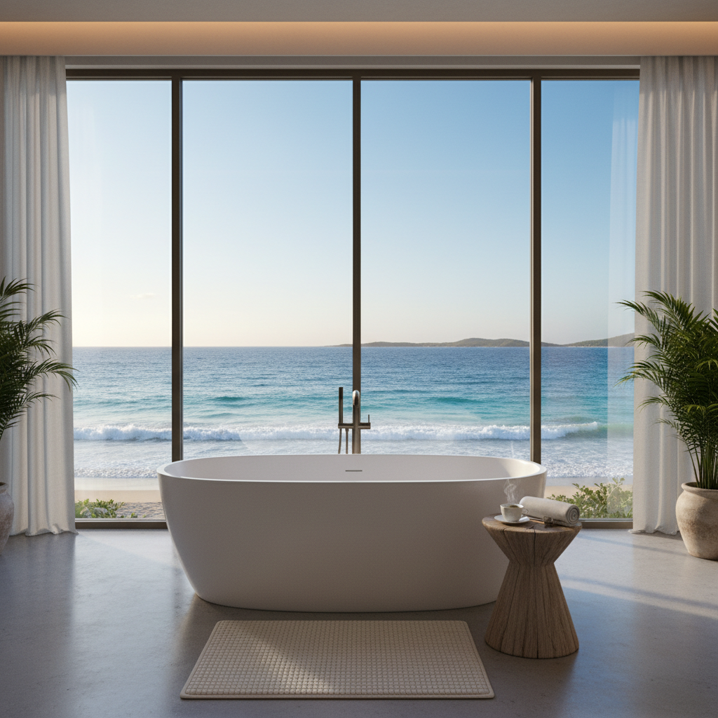 For the ultimate indulgence, position a sleek, freestanding soaking tub to take advantage of an ocean view, if available. If not, a large window looking out onto a lush garden or even a carefully curated indoor plant display can create a similar effect. The sculptural form of a modern clawfoot or egg-shaped tub becomes the centerpiece. Keep the surrounding decor minimal to emphasize the view and the tub’s elegance. This setup creates an unparalleled spa-like experience, inviting deep relaxation and a profound connection to the surrounding environment.