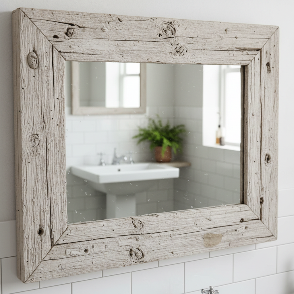 Frame your reflection with a mirror featuring a weathered wood frame. The aged, distressed look of the wood, often in shades of gray, white, or bleached natural tones, adds character and a sense of history. This material beautifully complements other natural elements in the room, like woven textures or linen fabrics. The rustic charm of the weathered wood contrasts elegantly with polished chrome or brushed nickel fixtures, creating a balanced aesthetic that feels both refined and relaxed. It’s a simple detail that makes a significant impact on the coastal mood.
