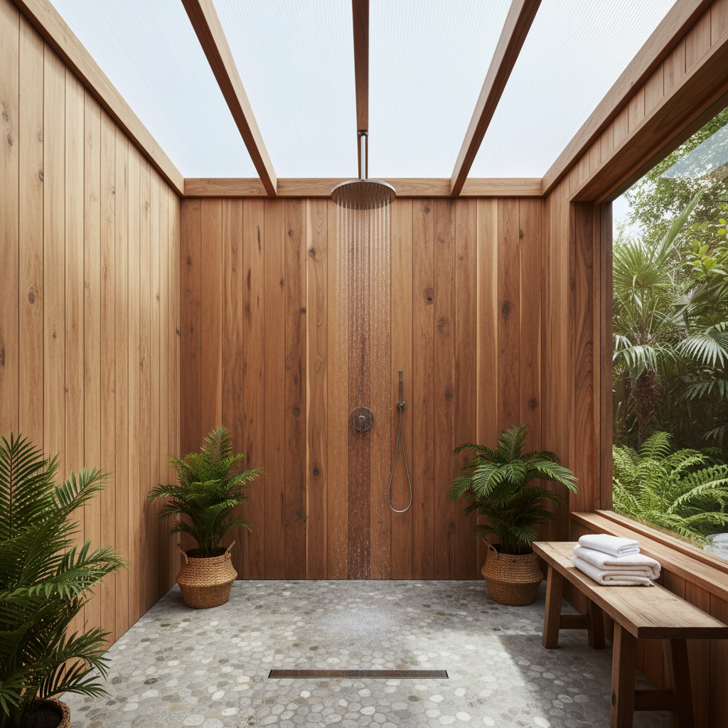 Recreate the refreshing experience of an outdoor shower within your bathroom. This can be achieved with natural wood paneling (like cedar or teak) on one or more shower walls, an open-concept shower without a full enclosure, and perhaps a rain showerhead. Incorporate large, leafy green plants that thrive in humidity to enhance the outdoor illusion. The color palette should be earthy greens and natural wood tones, with crisp white fixtures. This design evokes a sense of freedom and natural connection, making showering feel like a rejuvenating outdoor experience.