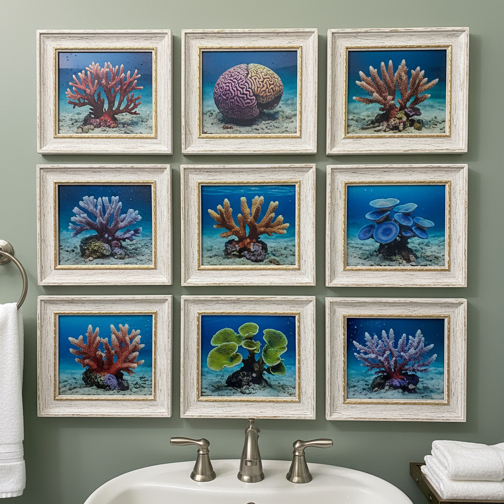Introduce the intricate beauty of the underwater world with coral-inspired art. Choose framed prints or canvases depicting various coral formations in soft, natural hues—whites, creams, pale pinks, or light blues. These pieces add a sophisticated biological element without being overly kitschy. They bring a subtle pop of color and an organic, sculptural quality to the walls. Paired with clean lines and a neutral background, coral art creates an elegant and refined coastal aesthetic that celebrates marine life.