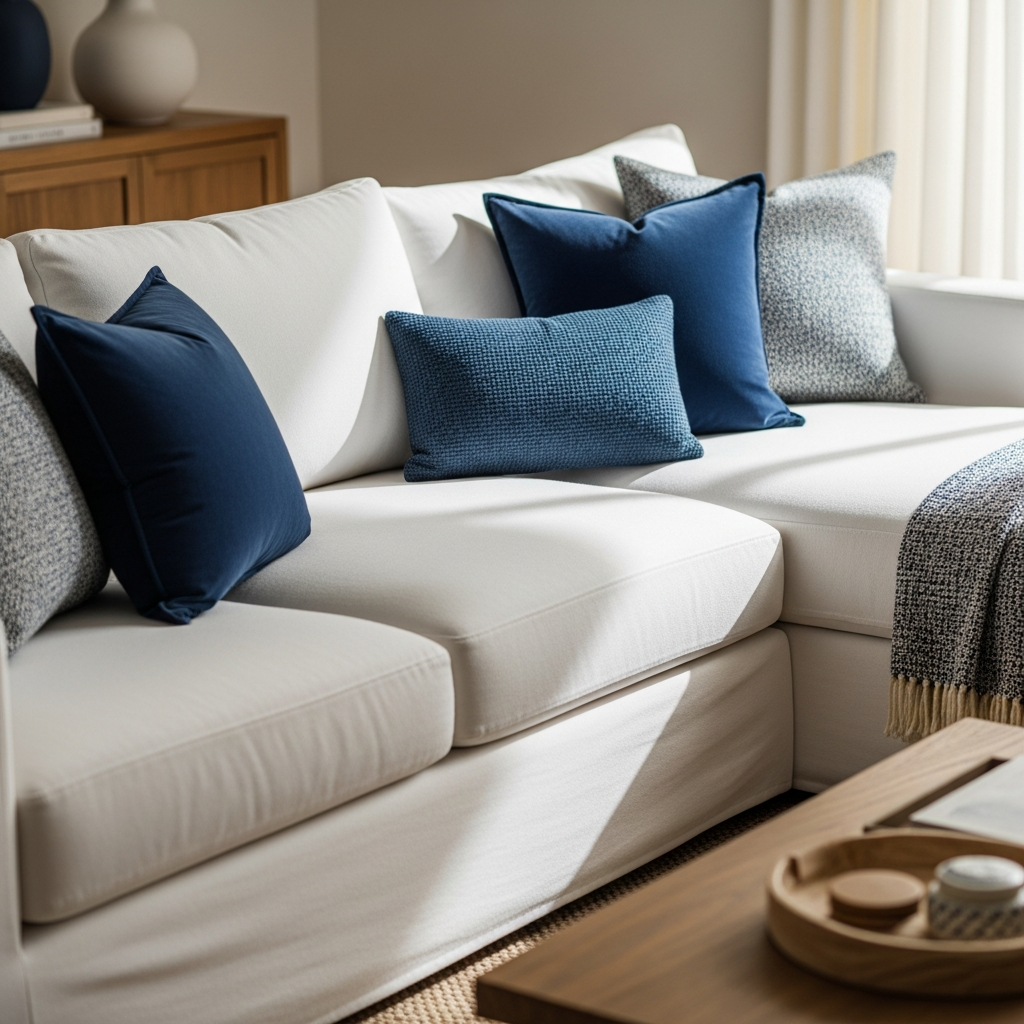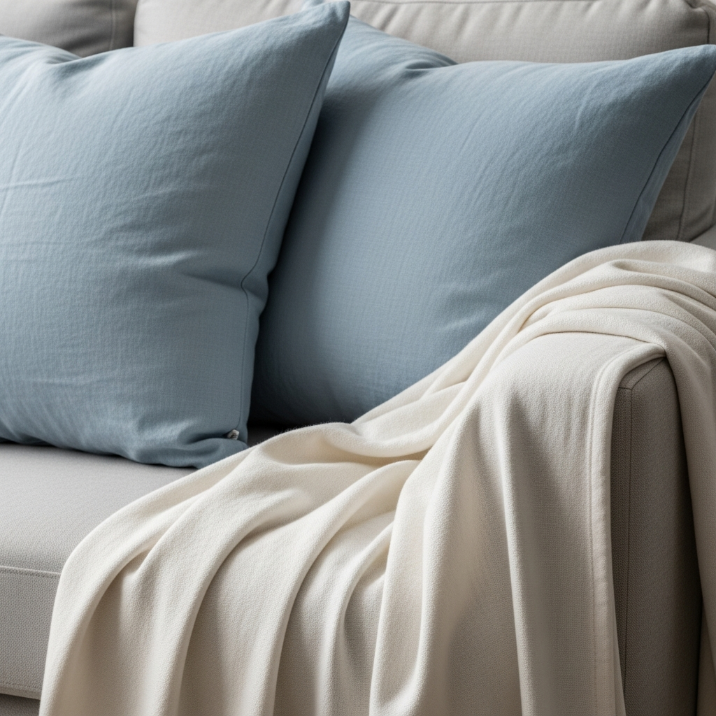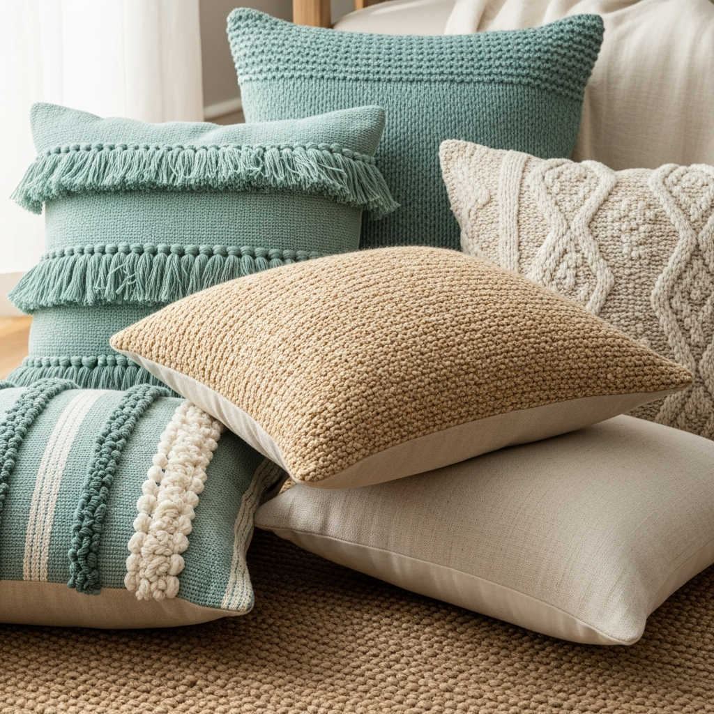 Texture is key to making a neutral room feel cozy. Mix pillows with different weaves, tassels, and embroidery. Incorporating various shades of blue and sandy tones through these textiles creates a layered and inviting seating area.
