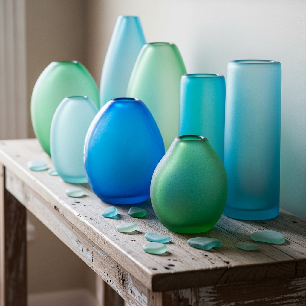 Sea glass, with its frosted texture and soft colors, serves as a delicate decorative element. Use glass vases in shades of turquoise, sage green, or pale blue to catch the light on mantels or side tables, adding a touch of oceanic shimmer to the space