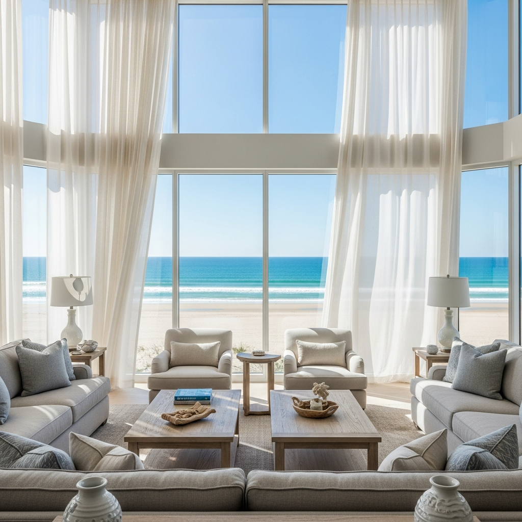 Light is perhaps the most important element of coastal design. Large, unobstructed windows allow sunlight to flood the room, mimicking the bright exposure of the beach. Keep window treatments minimal to ensure the connection between the indoors and the outdoors remains seamless.