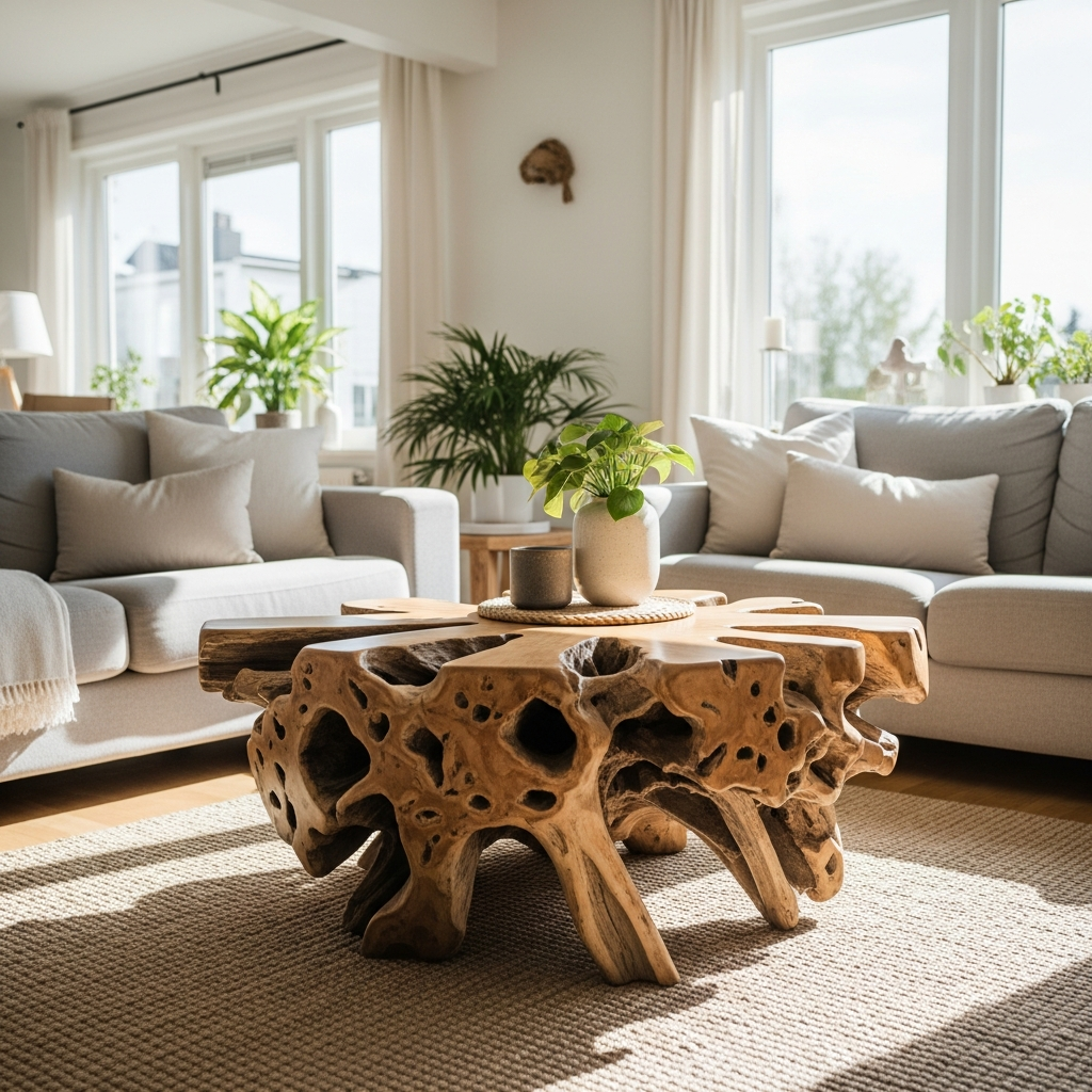 Driftwood furniture acts as a functional piece of art. A coffee table crafted from weathered wood brings a raw, sculptural element into the home. The greyish-brown tones of driftwood pair perfectly with both cool blues and warm whites, grounding the room in nature.