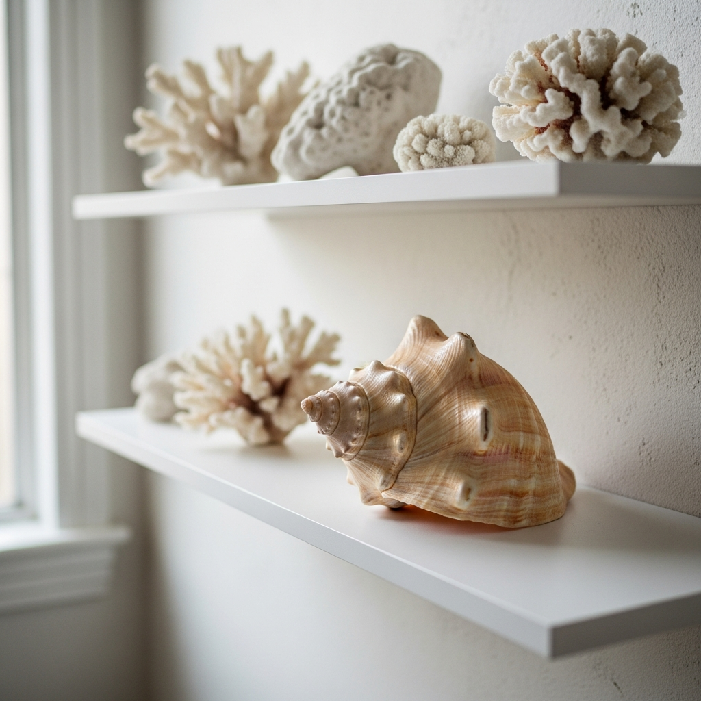 Instead of cluttering surfaces, use minimalist open shelving to display a curated collection of shells and coral. By leaving space between items, each piece feels like a specimen in a gallery, emphasizing its natural beauty and unique geometry.