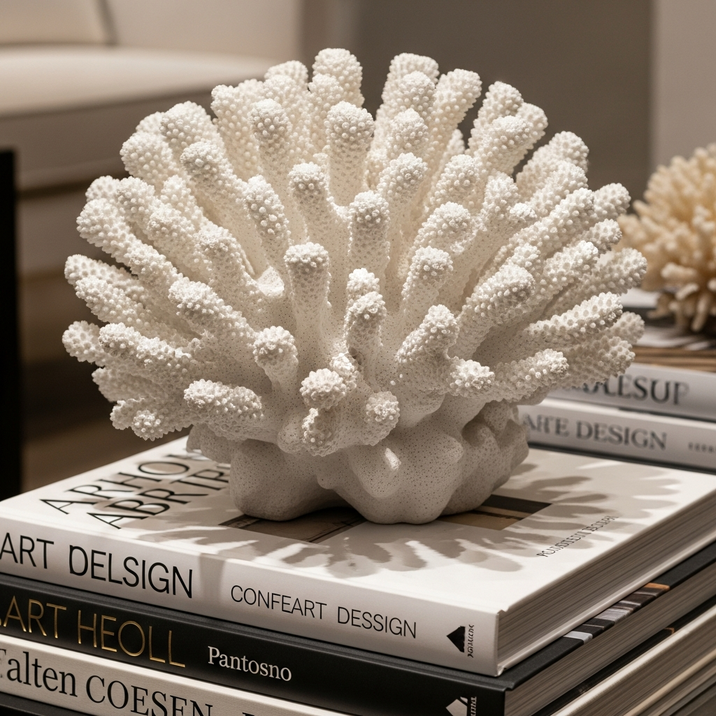 A large piece of faux coral can serve as a stunning centerpiece for a coffee table or mantel. Its intricate, organic shape provides a sophisticated focal point that immediately communicates the seaside theme without the need for additional clutter.