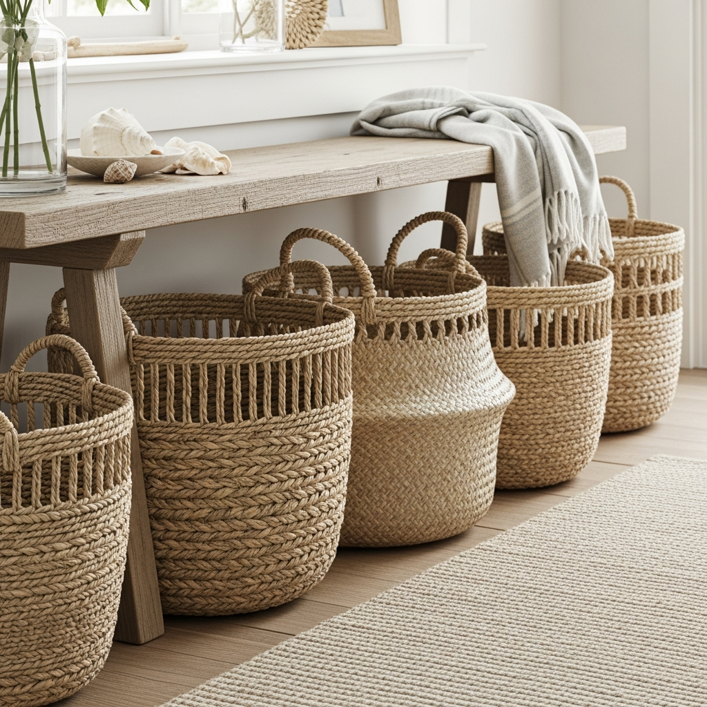 Functional storage can also be decorative. Woven seagrass or wicker baskets are perfect for holding extra blankets or magazines. Their texture complements other natural elements in the room while helping to keep the space organized and clutter-free.