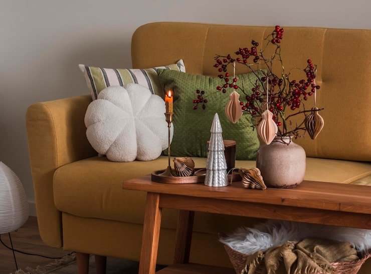 Bring in natural elements like plants, branches, or stones to add texture and interest.