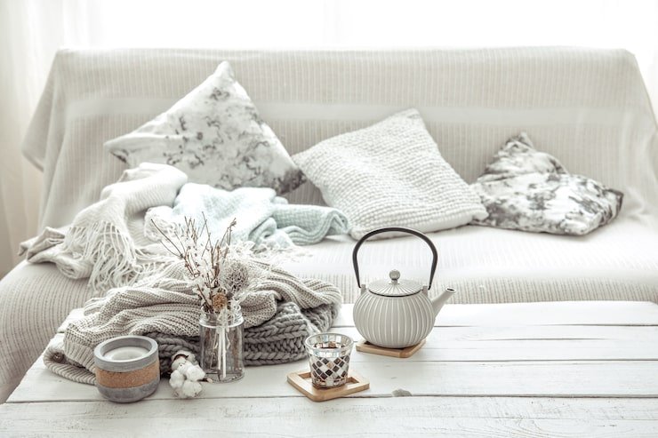 Use cozy textiles like throw blankets, rugs, and pillows in soft, natural materials.