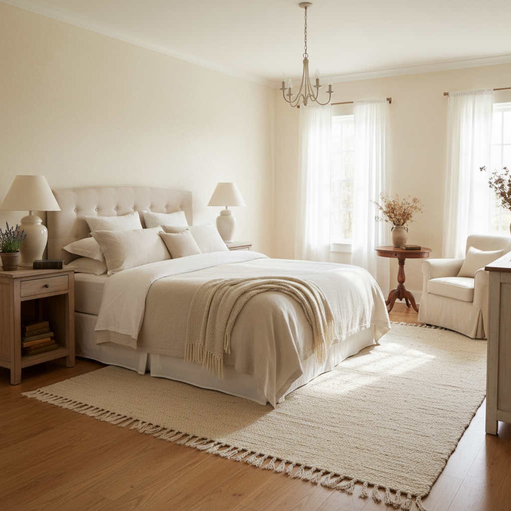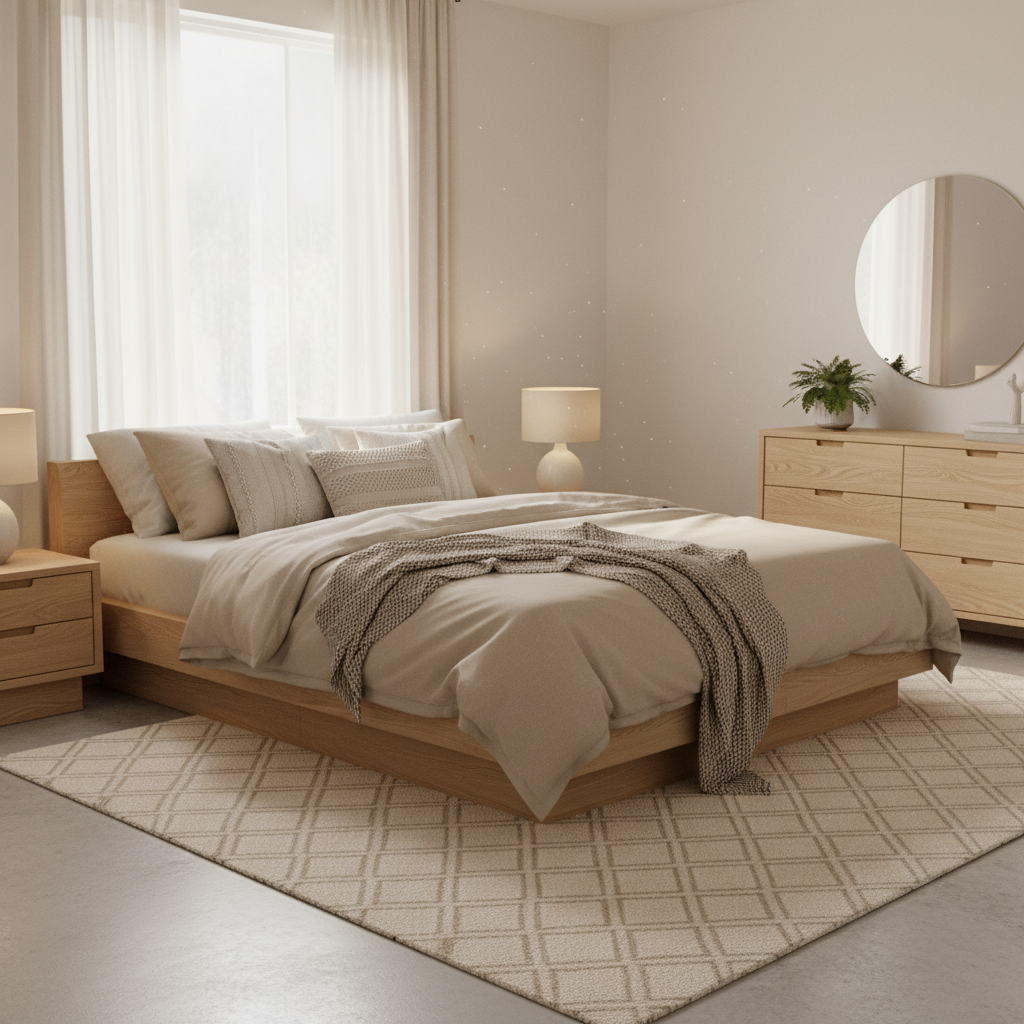 Anchor your space with a soft wool rug or a textured jute rug. These natural fiber rugs provide warmth underfoot, define the sleeping area, and introduce another layer of organic texture, making the room feel more grounded and complete.