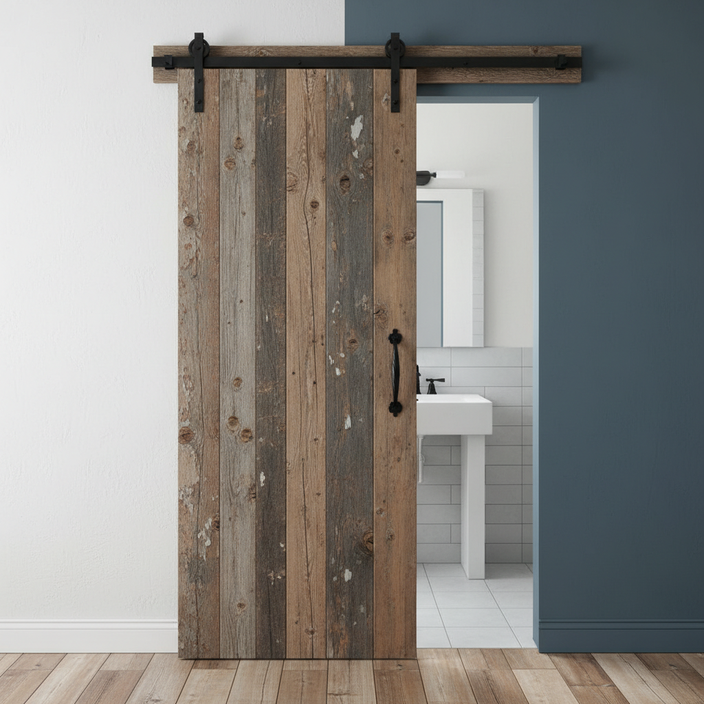 Replace a traditional hinged door with a sliding barn door for a practical and visually stunning rustic touch. Whether for a closet or an ensuite bathroom, a barn door adds character, saves space, and reinforces the country aesthetic with its charming, functional design.