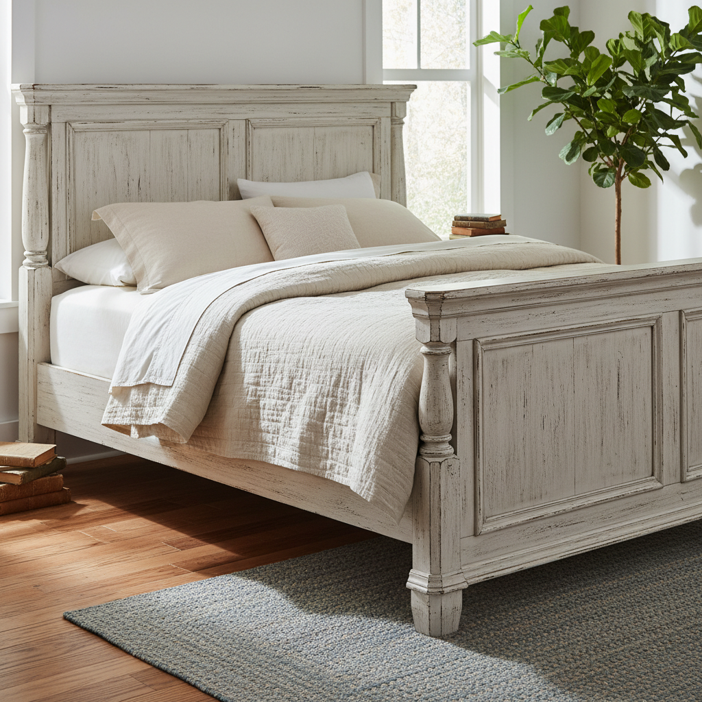A distressed farmhouse bed frame, perhaps in an antique white, weathered gray, or natural wood finish, is central to the country aesthetic. Its sturdy presence and imperfect charm anchor the room, inviting restful slumber. The mood is relaxed and unpretentious.