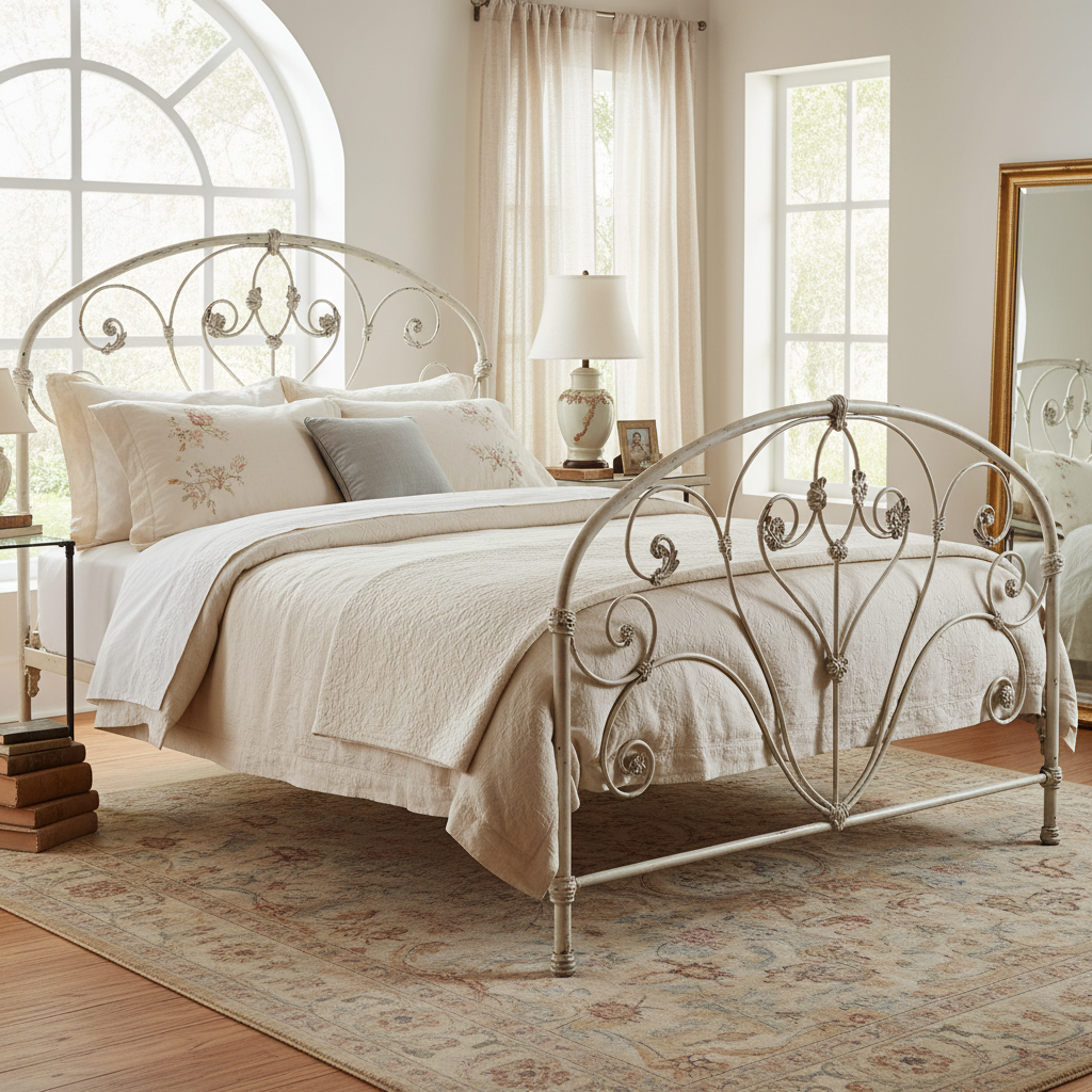 For a touch of antique elegance, a vintage iron or brass bed frame adds a lighter, more romantic rustic touch. Its delicate lines contrast beautifully with chunky textiles, creating a balanced and timeless appeal. It evokes old-world charm.