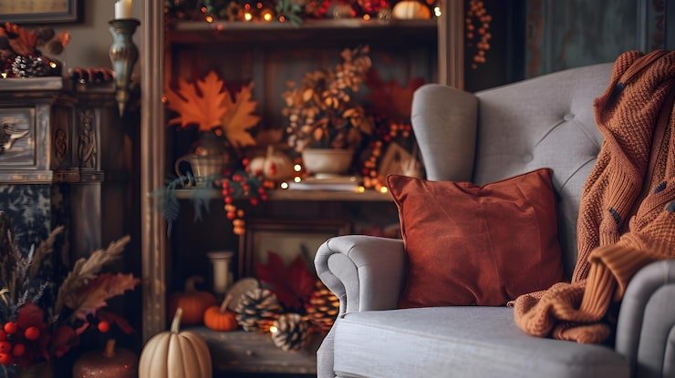 Swap out cool tones for warm, earthy shades that make the room feel instantly comforting. Think caramel, deep green, burgundy, cream, or warm gray. Even a few color changes — like new pillow covers or a cozy rug — can transform your living room.