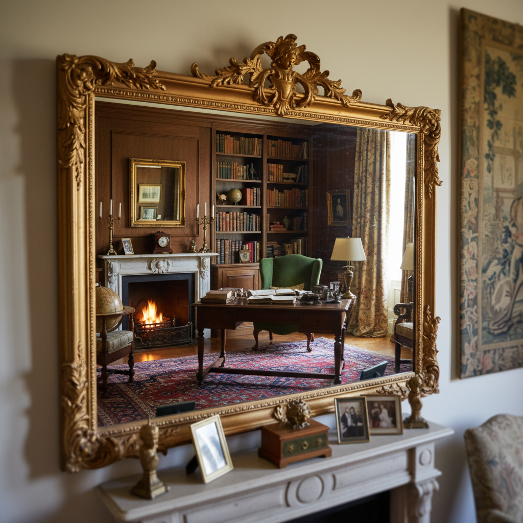 Incorporate ornate mirrors with gilded or dark wood frames. A large, beautifully framed mirror can not only reflect light, making the room feel more expansive, but also add a touch of historical grandeur. Position it to reflect a beautiful architectural detail or a curated display of books, enhancing the room’s sophisticated appeal.