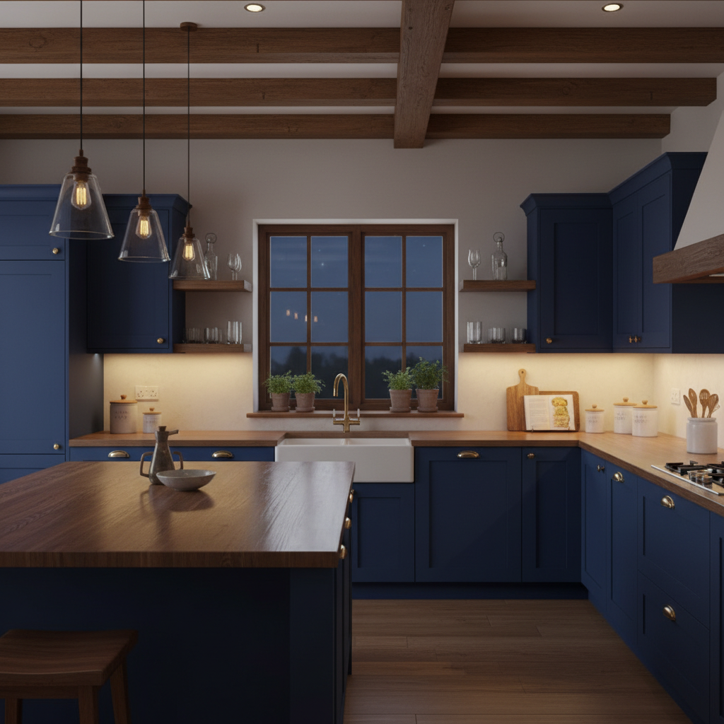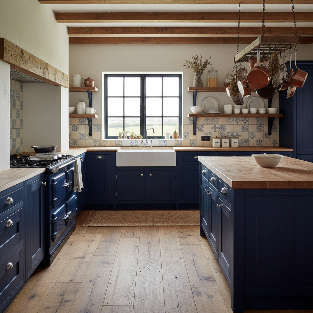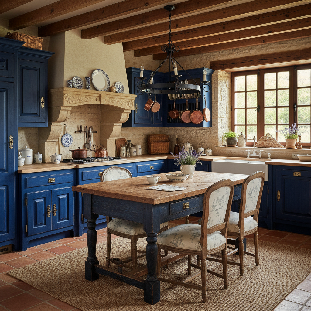 Infuse rustic elegance with a French Country inspired dark blue kitchen. This look is charming, warm, and full of character. The color palette features a slightly muted, deep blue (like a dusty indigo) paired with distressed wood, creamy whites, and wrought iron. Imagine dark blue cabinets with paneled doors, perhaps a vintage-style range hood, and open shelving displaying antique crockery. Materials include reclaimed wood, ceramic tiles, and wrought iron fixtures. Furniture shapes are often ornate, curved, and comfortable. The mood is nostalgic, inviting, and beautifully rustic with a touch of sophistication.