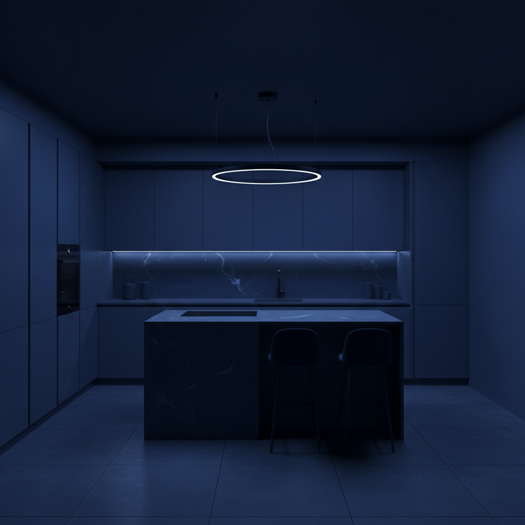 Achieve a sleek, futuristic look by incorporating integrated lighting into your dark blue kitchen design. This enhances functionality and creates a captivating ambiance. The color palette is deep and sophisticated, with the dark blue serving as a backdrop for soft, diffused light. Imagine flat-panel dark blue cabinets with hidden LED strips under upper cabinets, inside open shelving, or along toe kicks. Materials are often matte or semi-gloss, allowing the light to play off the surfaces. Furniture shapes are minimalist and highly functional. The mood is contemporary, high-tech, and effortlessly chic.