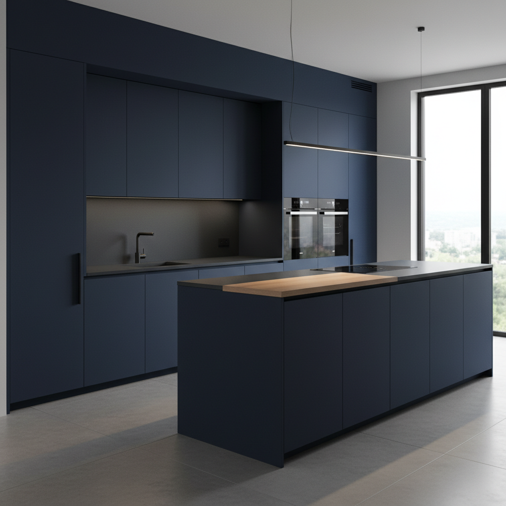 Embrace sleek simplicity with a minimalist midnight blue kitchen. This design focuses on clean lines, seamless surfaces, and an uncluttered aesthetic. The color palette is monochromatic, with varying shades of midnight blue dominating, perhaps with subtle grey or black accents. Think flat-panel, handleless cabinetry with integrated appliances for a truly flush look. Materials are often matte finishes, concrete countertops, or dark quartz. Furniture silhouettes are strictly geometric and unobtrusive. The mood is calm, modern, and incredibly sophisticated, a sanctuary of order and clean design.