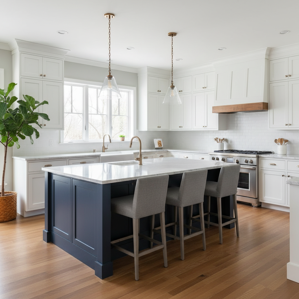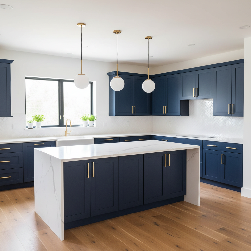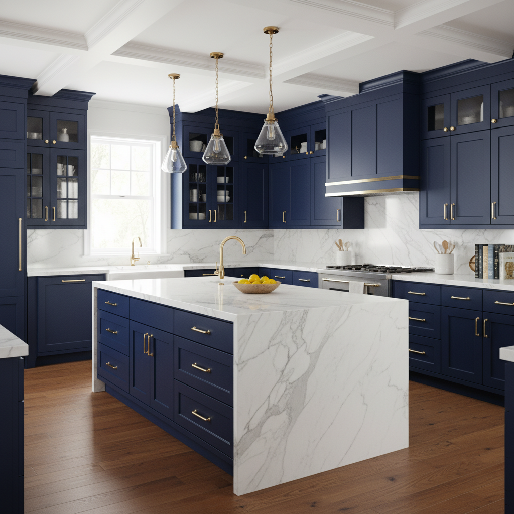 Imagine a kitchen where deep navy blue lower cabinets and a grand island anchor the space, contrasted by crisp white upper cabinetry or open shelving. This timeless combination creates an airy yet grounded feel. The color palette is fresh and enduring, with the navy providing a rich backdrop. Materials often include polished white marble countertops, classic subway tile backsplashes, and warm brass or brushed gold hardware, adding a touch of luxurious gleam. Furniture shapes are typically clean-lined Shaker style or traditional raised panel, exuding a tailored elegance. The overall mood is one of refined comfort and approachable luxury.