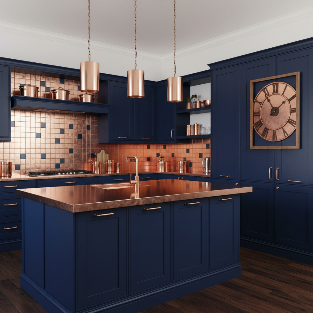 Elevate your dark blue kitchen with the warm, rosy glow of copper. This pairing is unexpected and utterly captivating, adding a touch of artisanal elegance. The color palette blends the cool depth of navy with the warm metallic sheen of copper. Imagine navy blue cabinets with gleaming copper handles, a custom copper range hood, or stunning copper pendant lights over an island. Materials can also include dark wood flooring and a simple, light-colored countertop to let the copper truly shine. Cabinetry styles can range from modern flat-panel to classic Shaker. The mood is rich, inviting, and exudes a unique, handcrafted charm.