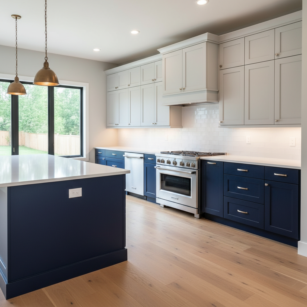 Introduce subtle variation and depth with a two-tone kitchen featuring dark blue and a complementary shade of grey. This approach creates visual interest without overwhelming the space. The color palette is sophisticated and harmonious, perhaps a deep slate blue on lower cabinets and a soft, warm grey on uppers. Materials can include light concrete countertops, stainless steel appliances, and brushed nickel hardware. Cabinetry often features simple Shaker or flat-panel designs. The mood is calm, balanced, and elegantly contemporary, offering a serene backdrop for daily life.
