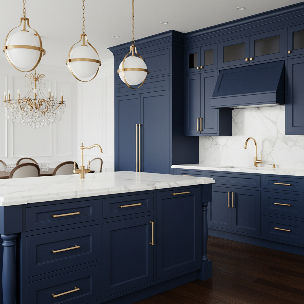 For a touch of pure opulence, combine dark blue cabinetry with generous gold accents. This look is undeniably glamorous and sophisticated. The color palette is regal, pairing deep navy or royal blue with the radiant warmth of gold. Picture dark blue cabinets adorned with polished gold bar pulls, a statement gold faucet, and exquisite gold pendant lights. White or light-colored marble countertops provide a luminous contrast. Cabinetry can be sleek flat-panel for a modern feel or ornate raised panel for classic luxury. The overall mood is one of high-end elegance and dazzling allure.