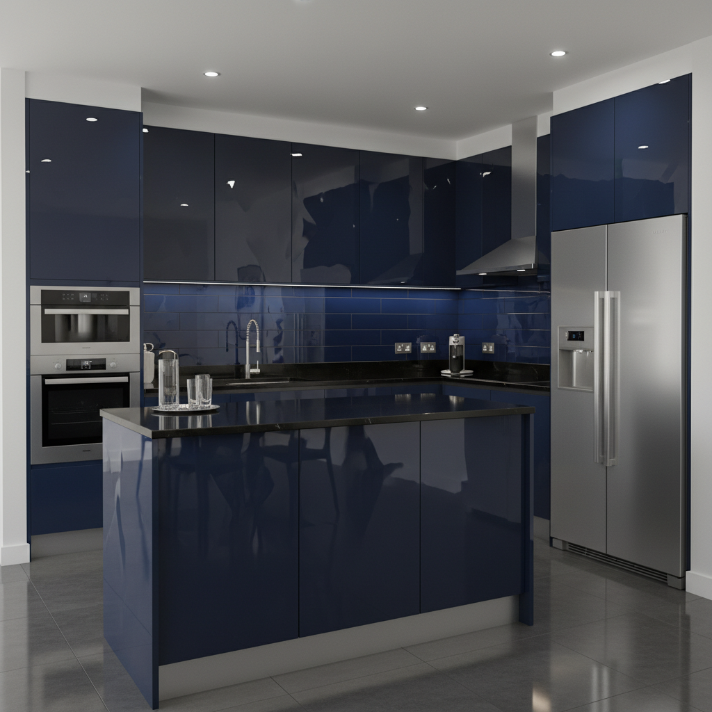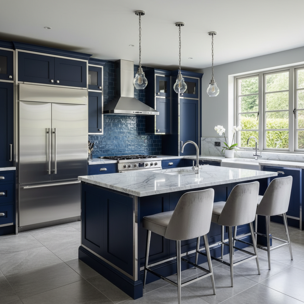 For a sleek and timeless appeal, pair dark blue cabinetry with the crisp, reflective sheen of chrome. This combination feels effortlessly modern and clean. The color palette is cool and sophisticated, with the deep blue providing a rich foundation for the bright chrome. Think navy or indigo cabinets with polished chrome handles, a chrome faucet, and stainless steel appliances. White marble or light grey quartz countertops are perfect complements. Cabinetry styles are often contemporary flat-panel or classic Shaker. The overall mood is refined, polished, and quietly luxurious.