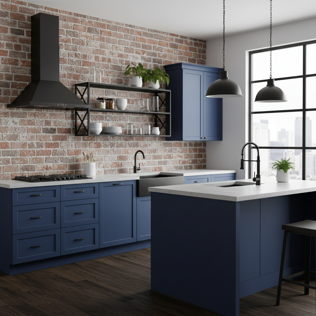 Infuse your kitchen with urban chic by combining a vibrant sapphire blue with industrial elements. This look is bold and contemporary, perfect for lofts or modern homes. The color palette is striking, with the jewel-toned blue taking center stage against raw, textural backdrops. Think sapphire blue flat-panel cabinets, exposed brick walls, concrete countertops, and black metal accents. Materials like stainless steel appliances, black iron lighting fixtures, and even visible ductwork enhance the industrial vibe. Furniture shapes are utilitarian and robust, with clean lines. The overall mood is edgy, dynamic, and effortlessly cool.