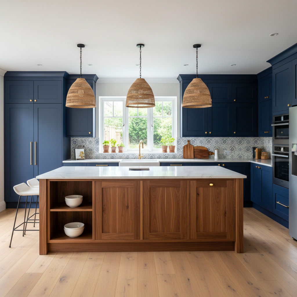 18. Navy Blue with Warm Walnut Island