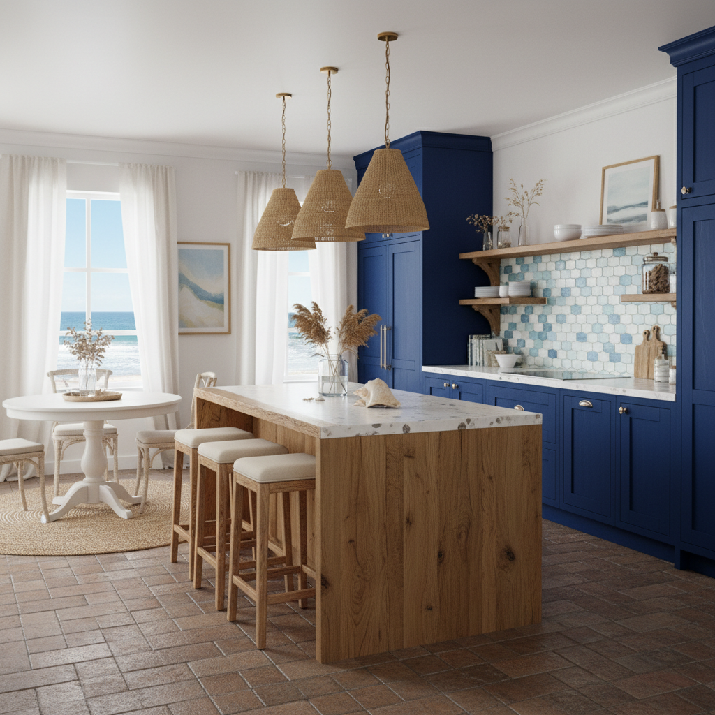 Bring the serene beauty of the coastline into your home with a deep blue kitchen that whispers of ocean depths. This look is calming and sophisticated, yet feels relaxed. The color palette draws from the sea, perhaps a slate blue or a deep ocean blue, paired with natural textures and lighter tones. Think woven rattan bar stools, light wood flooring (like bleached oak), white or light grey quartz countertops, and perhaps a subtle wave-patterned tile backsplash. Furniture shapes are often relaxed and comfortable, with an emphasis on natural materials. The mood is tranquil, breezy, and effortlessly chic, reminiscent of a luxurious seaside retreat.