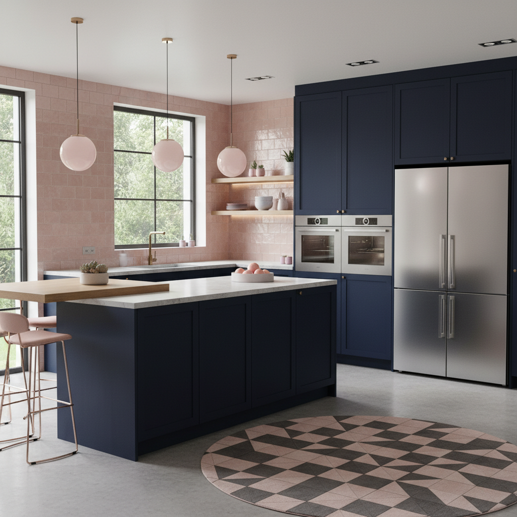 For a playful yet sophisticated twist, introduce subtle blush pink accents into a dark blue kitchen. This unexpected pairing is modern, chic, and adds a touch of softness. The color palette is bold yet balanced, with the deep blue providing a strong base for delicate pink. Consider dark blue cabinets with a pale pink backsplash, a few blush-toned decorative items, or even subtle pink lighting fixtures. Materials can include light wood flooring and white countertops. Furniture shapes are typically minimalist and contemporary. The mood is stylish, fresh, and uniquely charming.