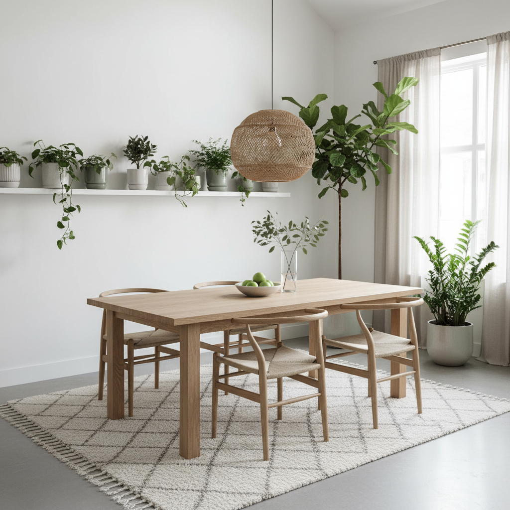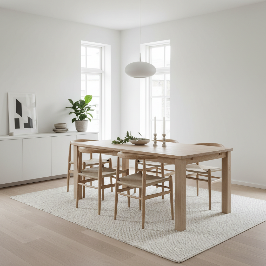This style is a pure celebration of functionality, light, and understated beauty. The color palette is dominated by crisp whites, light grays, and natural wood. Furniture is typically made from light-colored wood, featuring clean lines and practical design, often with a retro twist. Minimal decor, simple pendant lighting, and the emphasis on natural light create an airy, fresh, and highly functional dining space that feels effortlessly chic.