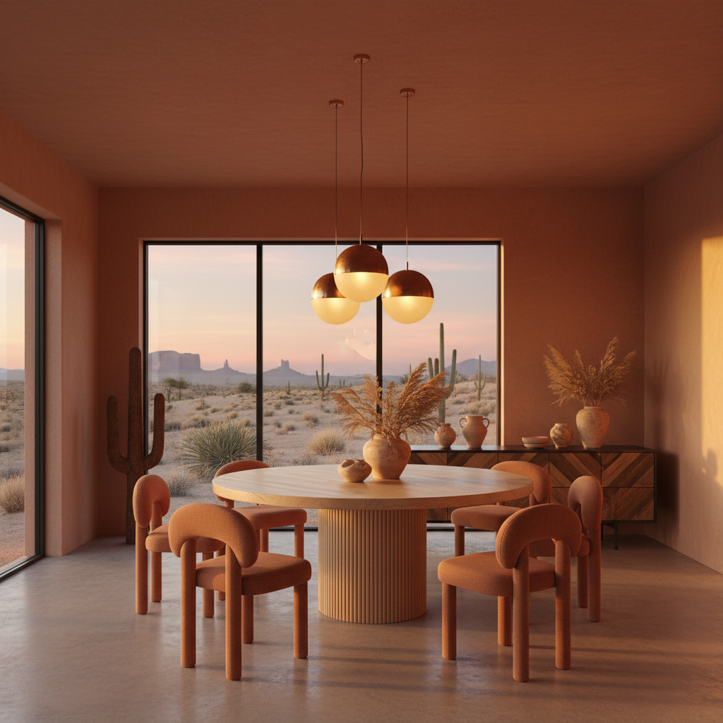 Inspired by the arid landscapes and modernist architecture of the American Southwest, this style brings warmth and sculptural beauty. The color palette features terracotta, sand, muted greens, and warm browns, often accented with black. Materials include natural wood, leather, plaster, and stone. Furniture often has organic, sculptural forms. Cacti or succulent arrangements and woven textiles add to the serene, earthy, and sophisticated desert mood.