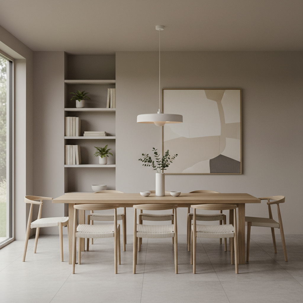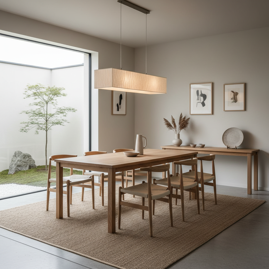 A beautiful fusion of Japanese minimalism and Scandinavian warmth, Japandi creates a tranquil and functional dining space. The color palette is muted—soft grays, whites, and natural wood tones. Furniture is exceptionally clean-lined, functional, and crafted from light woods like oak or ash, with a focus on artisanal quality. Ceramic tableware and simple, natural textiles enhance the calm, uncluttered, and harmonious mood.