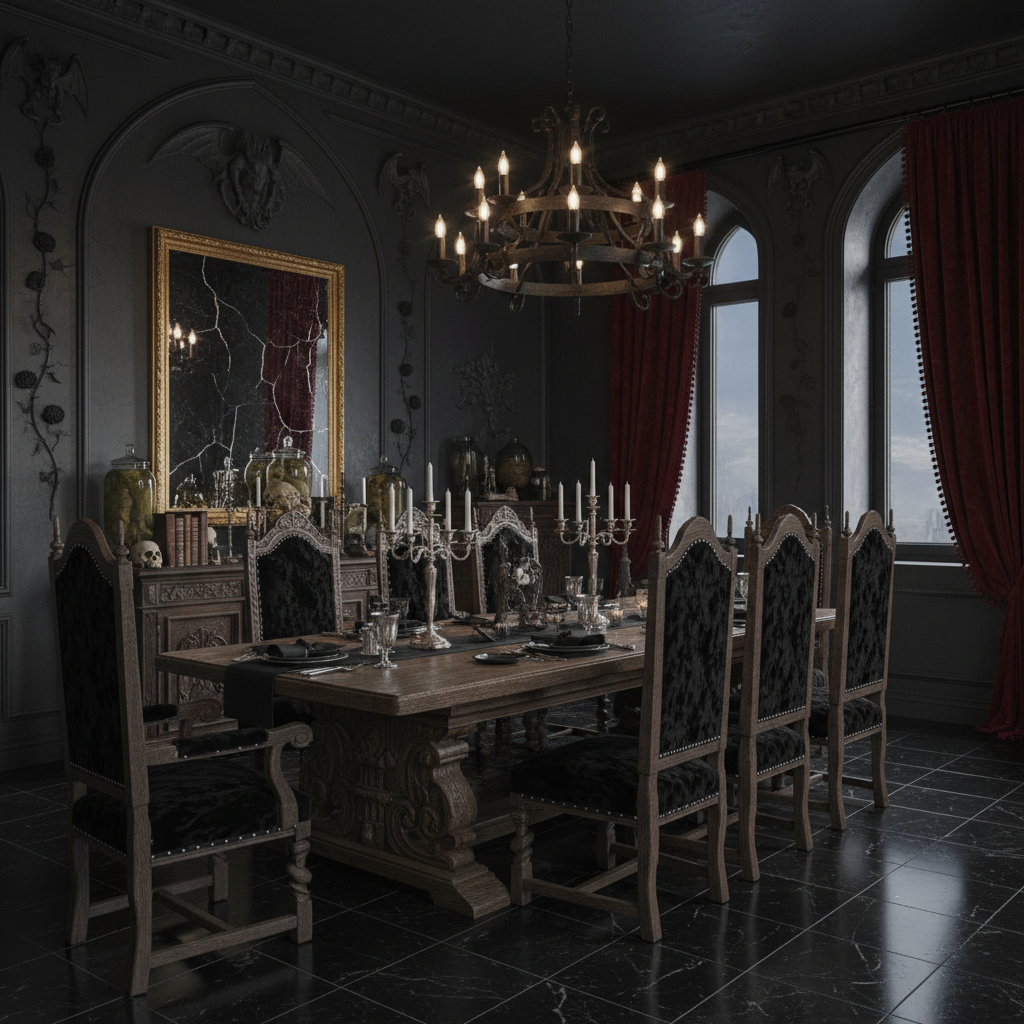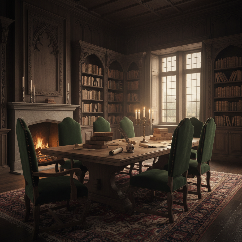 Create a dining room steeped in intellectual sophistication and a touch of gothic romance. The color palette is dark and moody—deep greens, browns, oxblood red, and charcoal gray. Materials include dark wood, aged leather, brass, and velvet. An antique or vintage-inspired dining table is paired with classic upholstered chairs. Bookshelves filled with old tomes, vintage maps, and atmospheric lighting complete the scholarly yet dramatic mood.