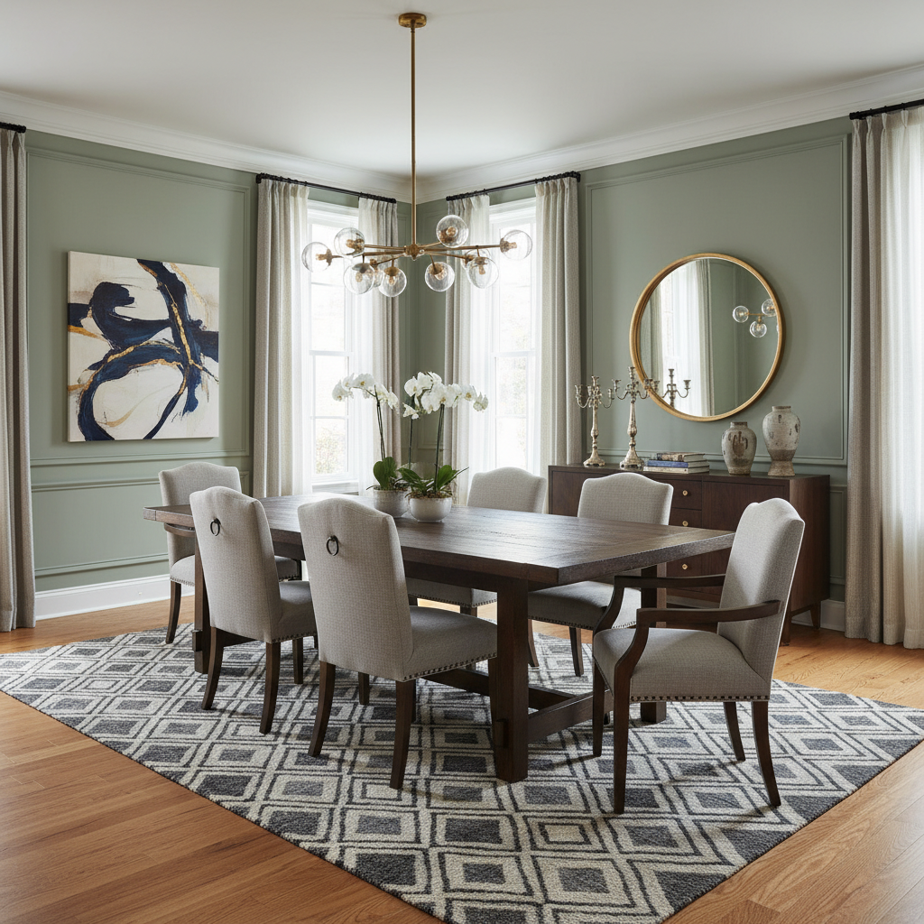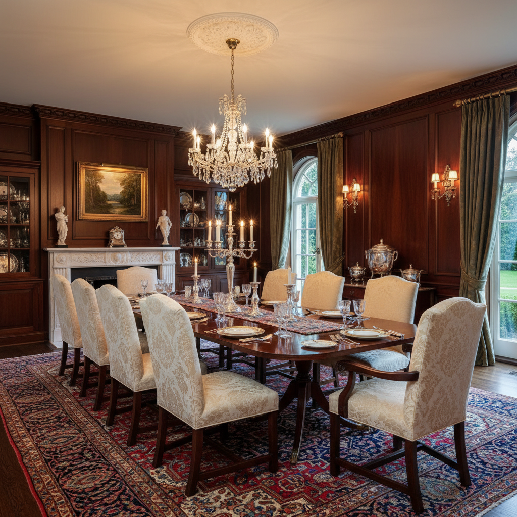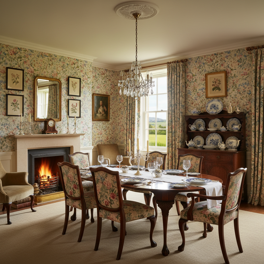 Evoke the comfort and charm of a traditional English home. This makeover uses a palette of soft, muted colors—sage green, dusty blue, cream, and rose. Floral or botanical wallpapers are a strong feature. A sturdy, often antique, wood dining table is surrounded by classic upholstered chairs in chintz or damask. Display cabinets filled with china, antique prints, and soft lighting create an intimate, warm, and inviting atmosphere.
