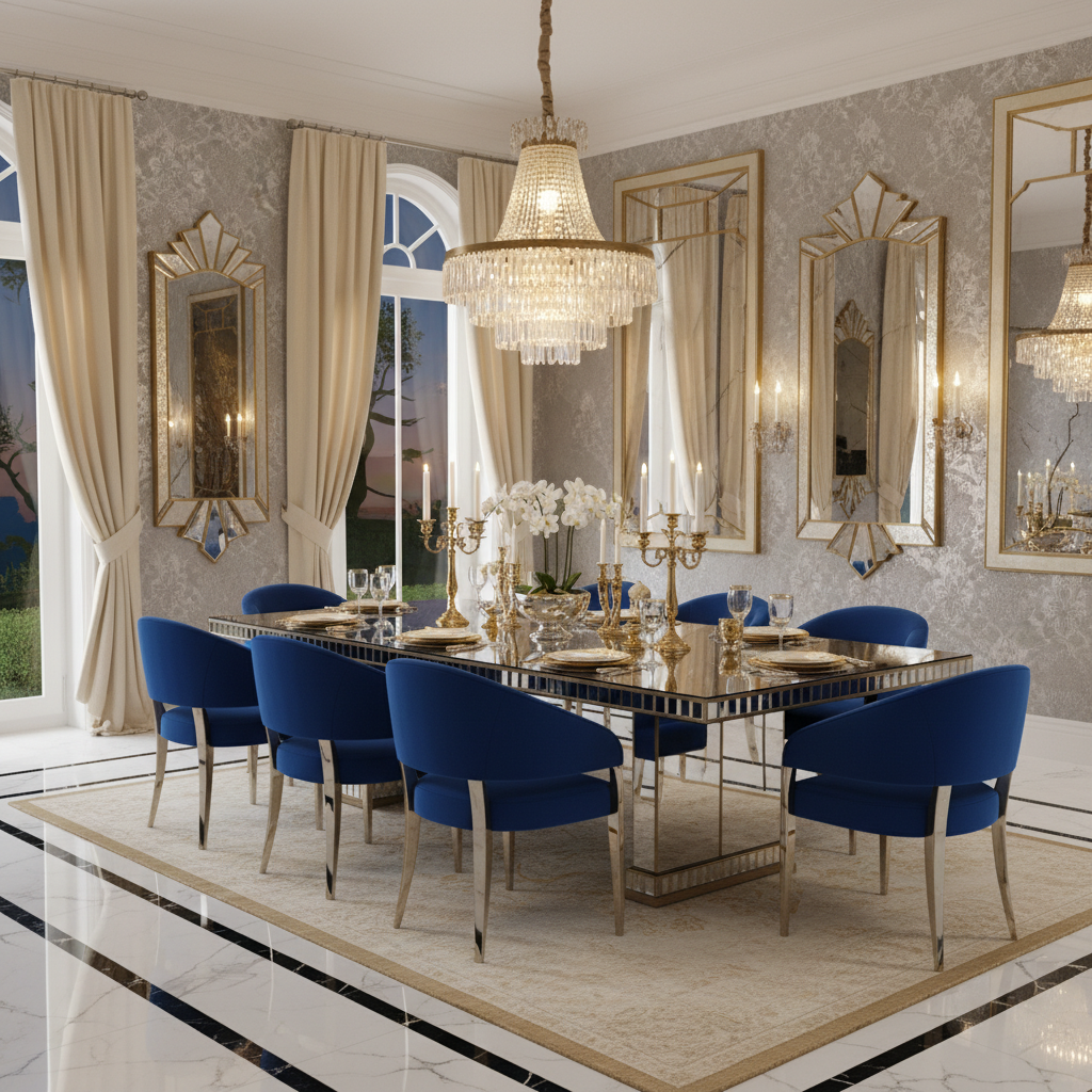 Channel the silver screen’s golden age with a dining room that radiates old-school glamour and sophistication. The color palette is bold and luxurious—black and white, gold, deep jewel tones like sapphire or ruby. Materials include mirrored surfaces, polished chrome, velvet, and lacquered finishes. Furniture is often ornate, with tufting, elaborate carvings, and high-gloss. Crystal chandeliers and dramatic lighting complete the opulent, dazzling mood.