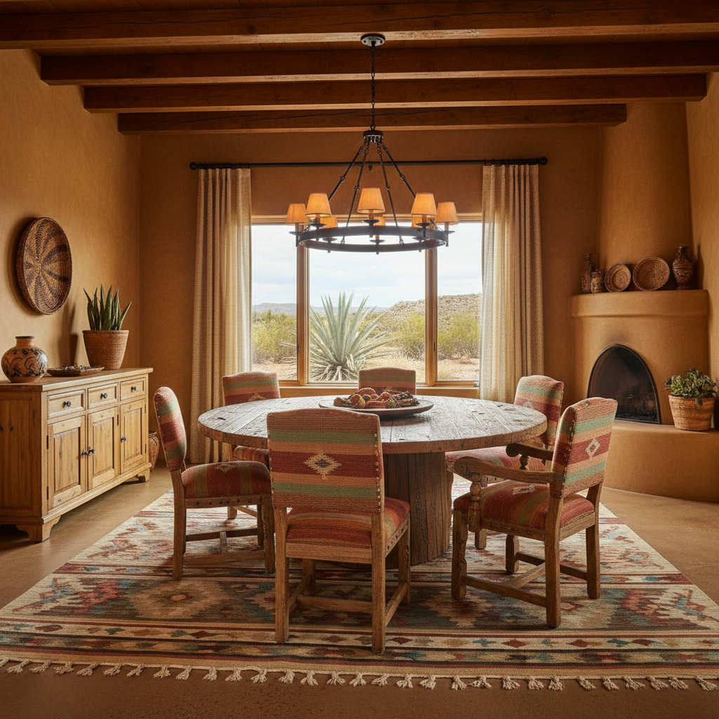 Embrace the vibrant colors and earthy textures of the American Southwest. The color palette features warm tones like terracotta, adobe red, sandy beige, and turquoise accents. Materials include rustic wood, leather, woven textiles, and natural stone. A sturdy, often handcrafted wood table is central, surrounded by chairs with a Southwestern motif or simple leather upholstery. Hand-woven rugs and pottery complete the inviting, rustic, and culturally rich atmosphere.