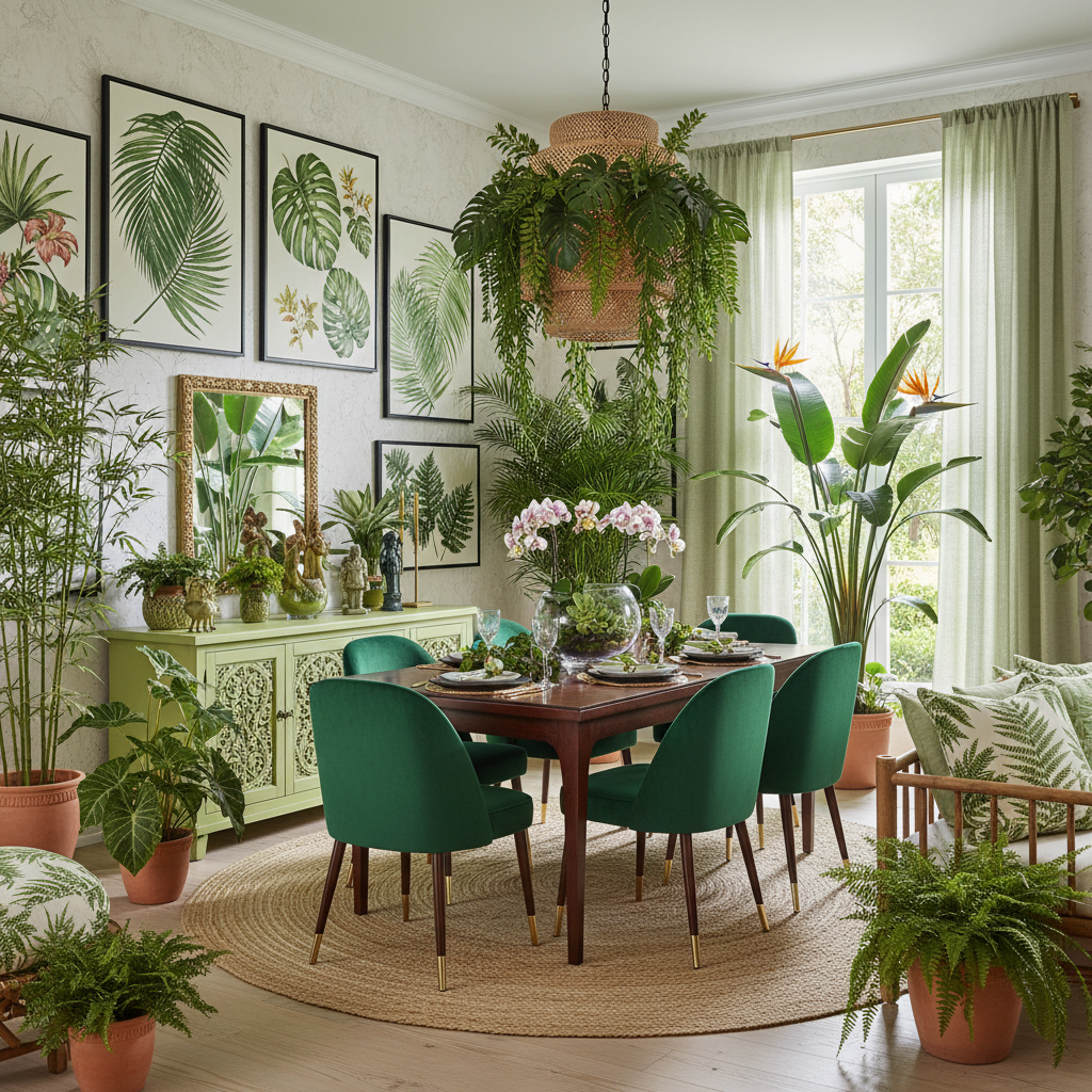 Inject a burst of exotic energy and lush beauty into your dining room. The color palette is bold and vibrant—emerald green, fuchsia, turquoise, and sunny yellow. Botanical prints, especially large-leaf patterns, are prominent on wallpaper or textiles. Rattan or bamboo furniture, natural wood tables, and abundant live plants create an immersive, lively, and wonderfully refreshing mood, like dining in a luxurious jungle retreat.