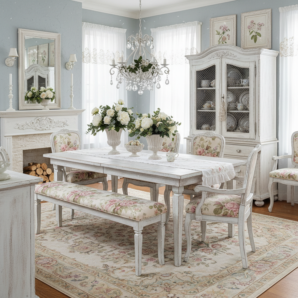 Infuse your dining space with a romantic, slightly worn, and wonderfully feminine charm. This makeover features distressed white or pastel-painted furniture, often with vintage appeal. A large, rustic table might be paired with mismatched chairs, all unified by a soft color palette of creams, blush pinks, and pale blues. Floral patterns, lace, and delicate crystal accents are key. The mood is relaxed, charming, and beautifully nostalgic.