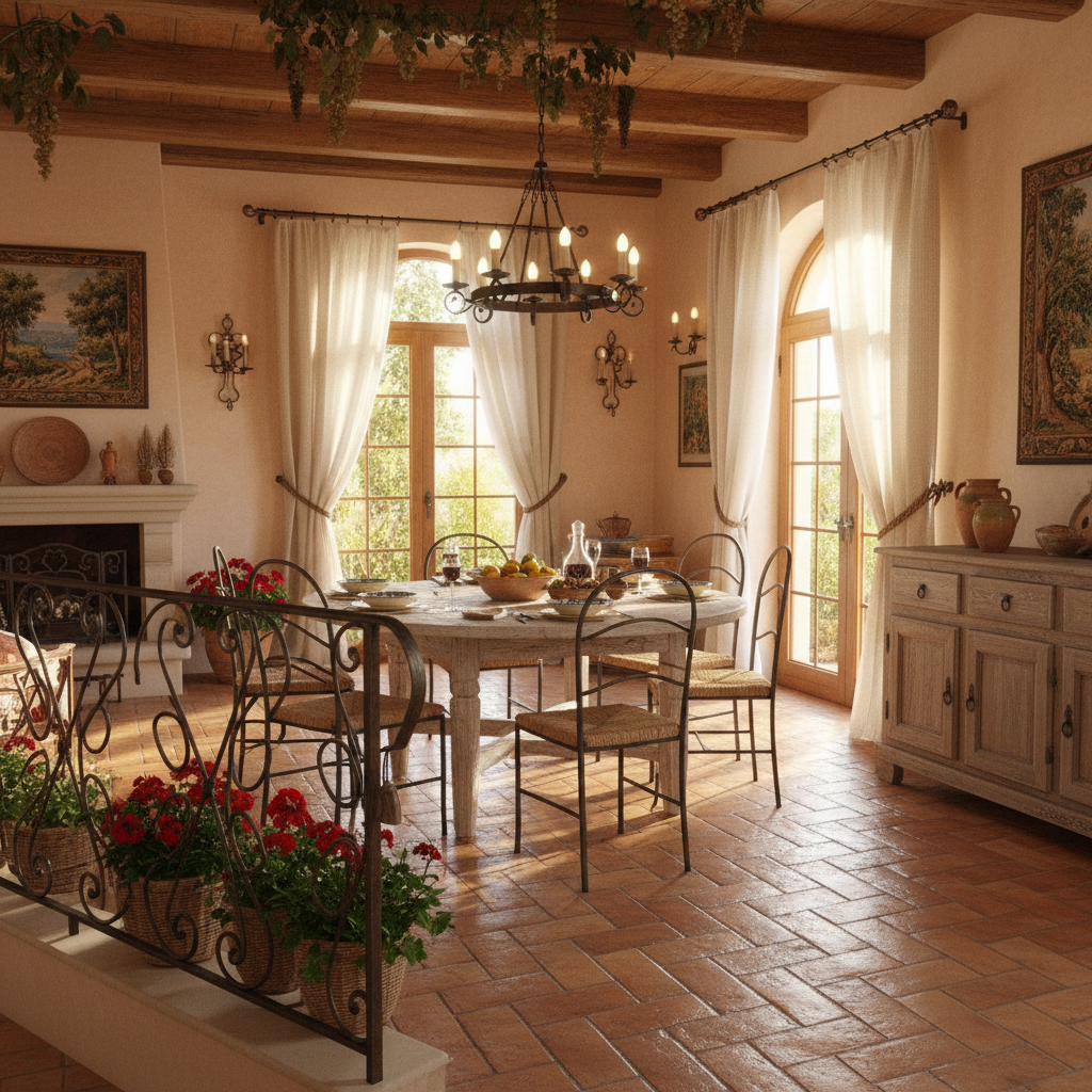 Transport your dining experience to the sun-drenched coasts of the Mediterranean. The color palette features warm earth tones—terracotta, olive green, deep blues, and creamy whites. Materials include rustic wood, wrought iron, mosaic tiles, and textured stucco. A sturdy, often dark wood table is paired with chairs featuring woven seats or carved details. The mood is relaxed, inviting, and full of old-world charm, perfect for long, leisurely meals.