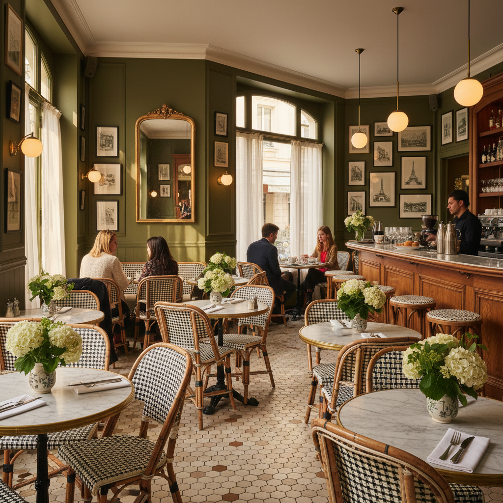Capture the timeless charm of a Parisian eatery. This look features a sophisticated blend of black and white, perhaps with subtle pops of brass or deep burgundy. Bistro-style seating, often with woven rattan or bentwood details, surrounds round or rectangular marble-topped tables. Mirrored walls or large framed art add depth and elegance. The mood is intimate, chic, and effortlessly stylish, perfect for lingering conversations and delicious food.